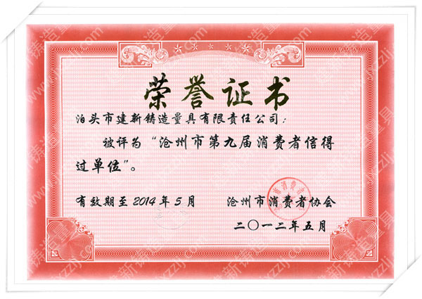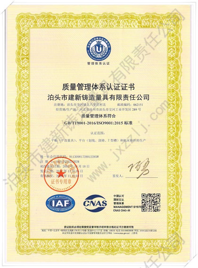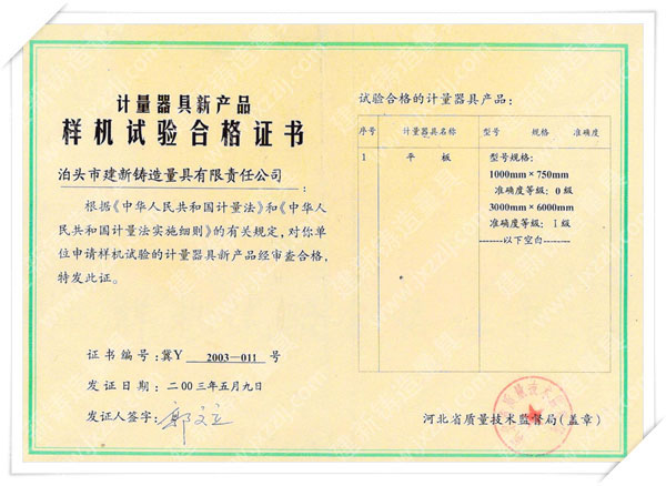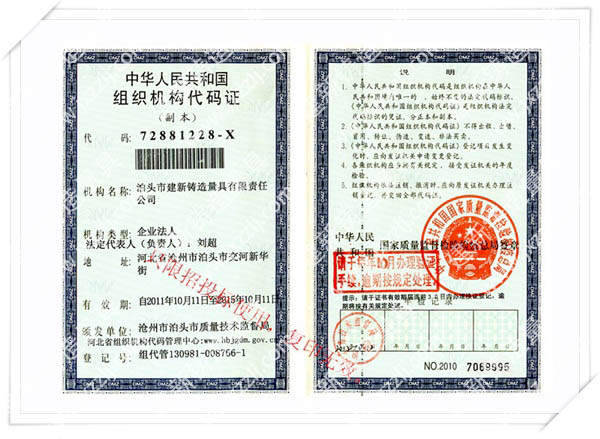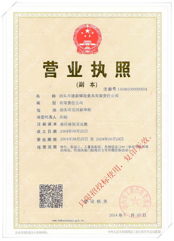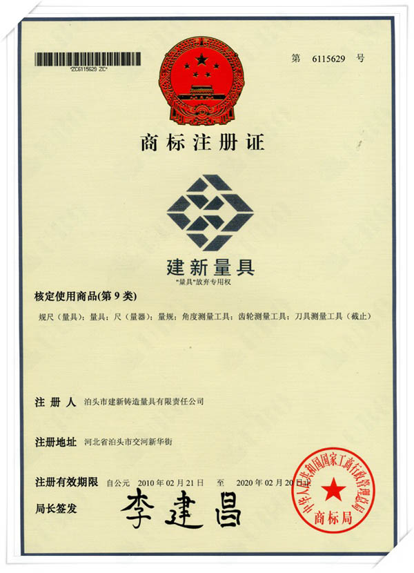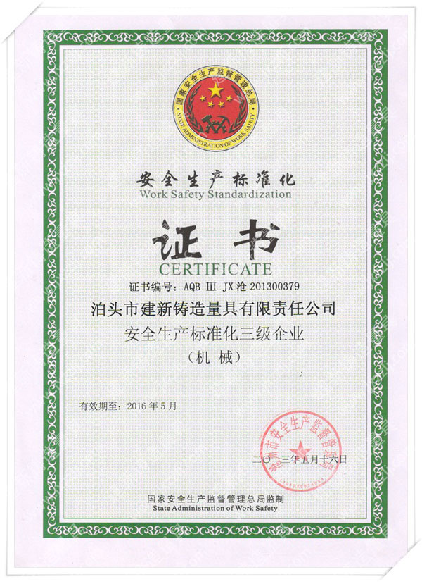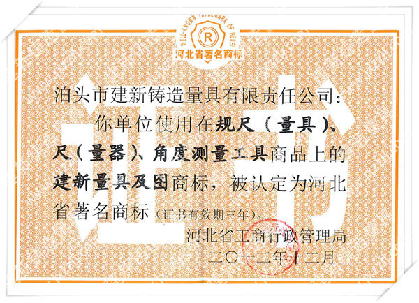 泊頭市建新鑄造量具有限責(zé)任公司是河北省固定資產(chǎn)重點(diǎn)投資項(xiàng)目技術(shù)企業(yè)。取得“建新量具-商標(biāo)注冊(cè)證”“河北省名牌產(chǎn)品”、“河北省著名商標(biāo)”、中國(guó)鑄造協(xié)會(huì)常任理事單位“機(jī)械工業(yè)質(zhì)量管理獎(jiǎng)”、“滄州市第九屆消費(fèi)者信得過(guò)單位”、“中國(guó)人民銀行機(jī)構(gòu)信用代碼證”“、計(jì)量器具新產(chǎn)品樣機(jī)試驗(yàn)合格證書(shū)“全國(guó)安全生產(chǎn)三級(jí)認(rèn)證企業(yè)”等榮譽(yù)稱號(hào)。